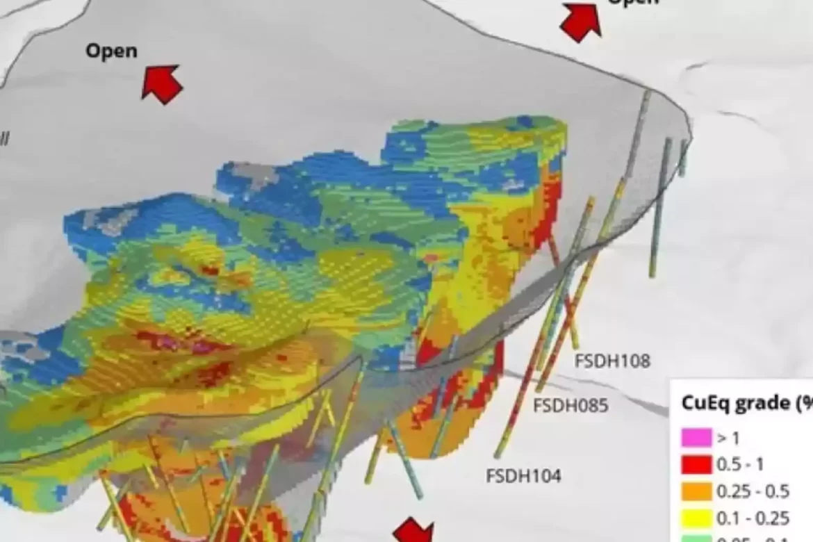 Según el informe oficial de la compañía, las estimaciones preliminares arrojan cifras impactantes: 32 millones de onzas de oro (más otras 49 millones inferidas), 659 millones de onzas de plata (más 808 millones inferidas) y 13 millones de toneladas de cobre, con un potencial adicional de 25 millones de toneladas inferidas.