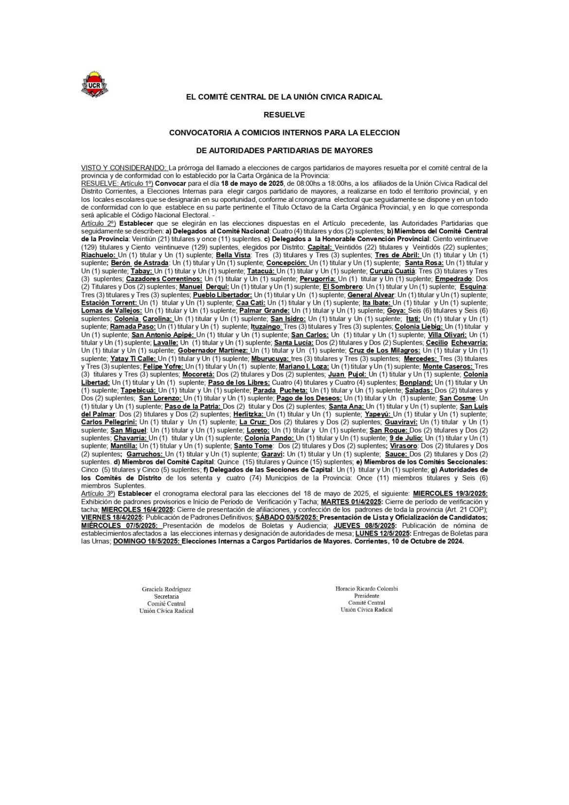 La Unión Cívica Radical (UCR) de Corrientes vive momentos de alta tensión interna tras la decisión de su Comité Central de convocar a elecciones internas de autoridades partidarias para el 18 de mayo de 2025. La resolución, que lleva las firmas del presidente del Comité, Ricardo Colombi, y la secretaria general, Graciela Rodríguez, fue dada a conocer ayer por la tarde, sorprendiendo a varios sectores dentro del partido.