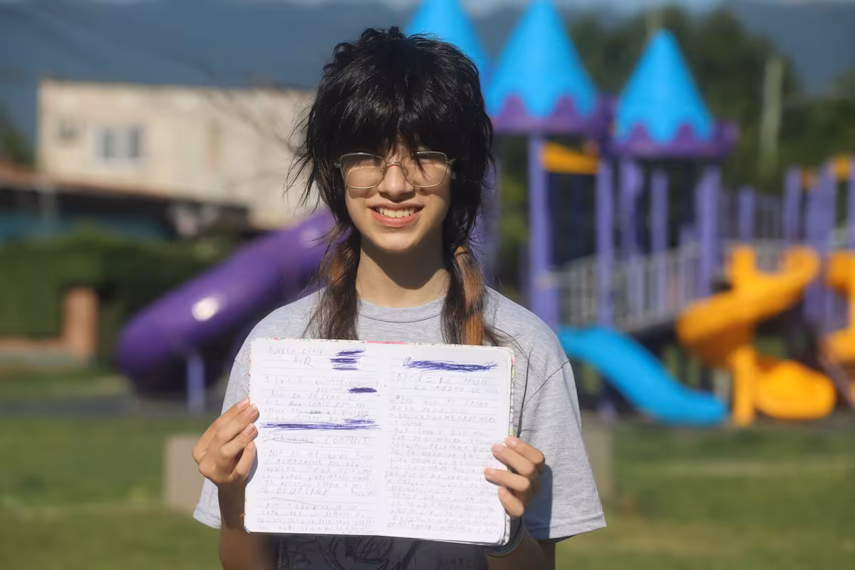 Desde la salita de la pequeña casa que comparte con su abuela, su mamá y tres hermanos, Jazmín Francés muestra los dos cuadernos donde escribió la novela “Donde no duele vivir”. Cuenta la historia de un chico de 18 años que tiene autismo y es abandonado por sus padres en un hospital psiquiátrico. Lo escribió a mano con una birome, con tachaduras y correcciones sobre las hojas de papel.