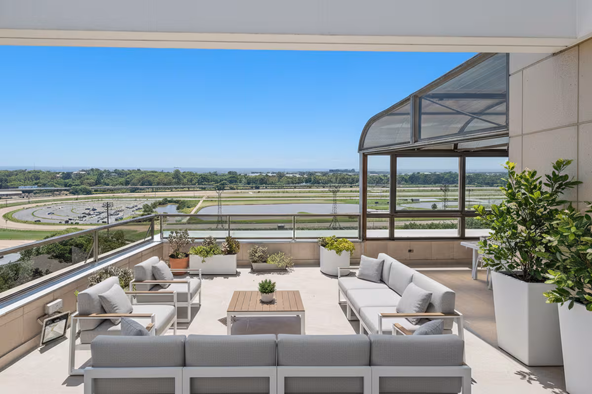 Se trata de un dúplex de 450 m², cinco ambientes y tres cocheras, que salió al mercado por US$2,7 millones. La unidad es la más grande del edificio y cuenta con la terraza privada más importante del complejo: casi 100 m² con vistas abiertas al Río de la Plata, al Hipódromo y al Campo Argentino de Polo.